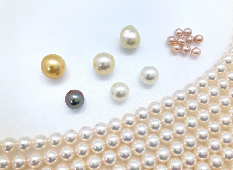 真っ白だけでなく、ピンクっぽいパールや、黄色っぽいパールなど、色んな色合いがあって、カタチや大きさも様々。真珠のほかに、天然石やサンゴも選べます。