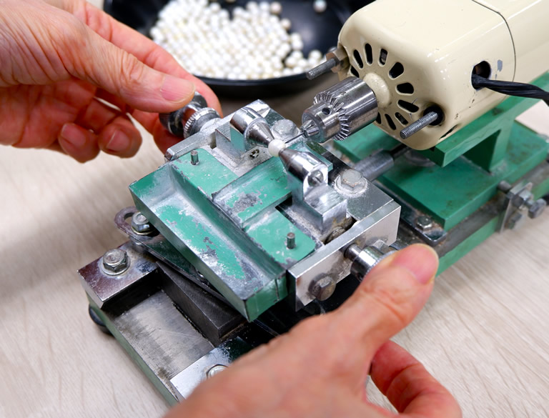 形や色を見て、一番美しく見える場所を瞬時に判断する穴あけもまた、経験と精密さが欠かせない作業。さらに、真珠の黒っぽさを取り除く染み抜き方法など、企業秘密の技術も多いのだとか。