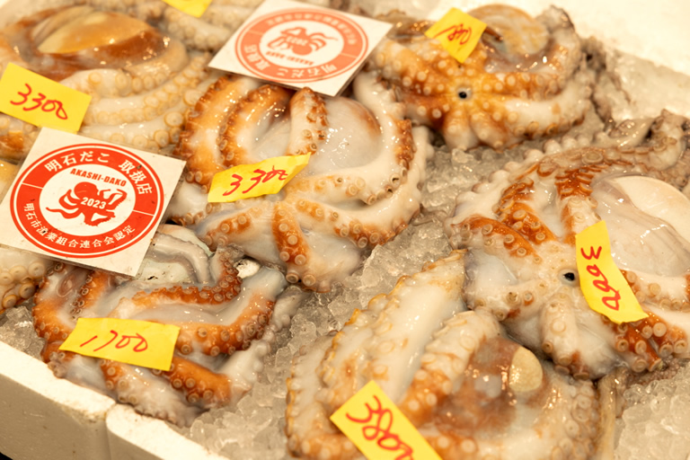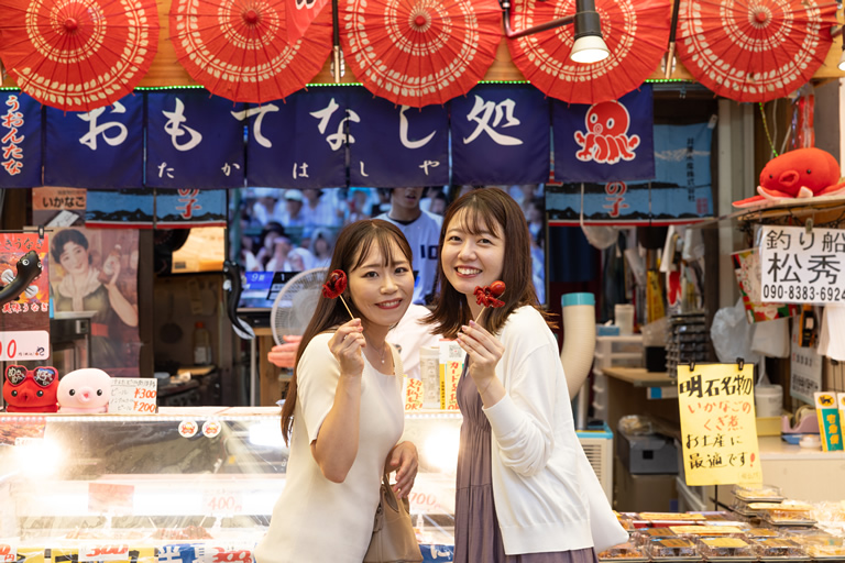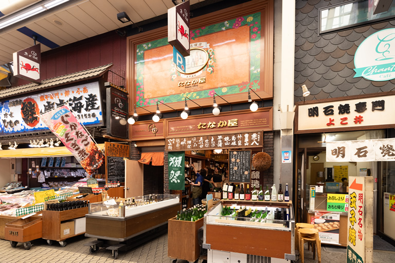 100店舗以上が軒を連ねる地元民にも人気の商店街で、明石港で水揚げされた新鮮な魚介を使ったグルメを楽しめるお店がたくさんあります。