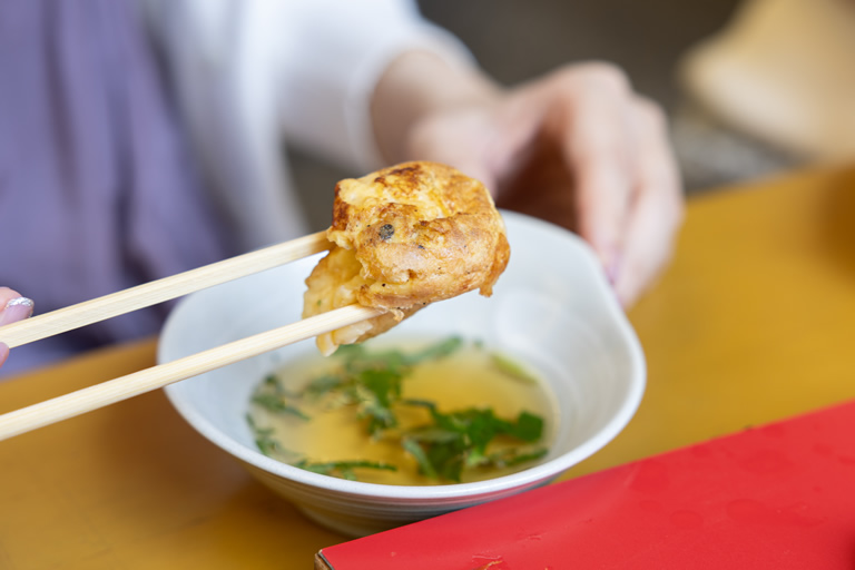 まずは商店街の中央にある「あかし多幸」で、明石名物の明石焼を注文。焼き立てアツアツを、利尻昆布を使った出汁に浸けて頬張ると、優しい旨味の出汁が染みたふわふわの生地が口の中でとろけます。中の明石産のタコの旨味も濃い!