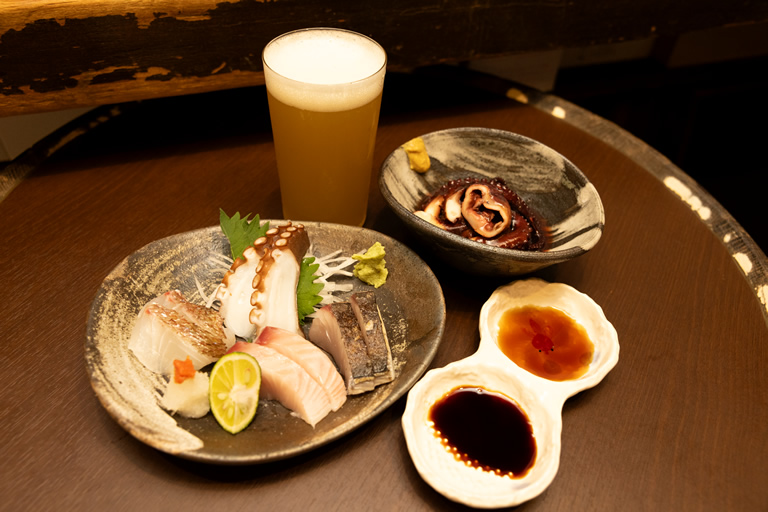 明石といえば明石鯛と明石タコということで、アテに選んだのは、明石のお刺身盛り合わせ1,200円(税込)と、明石タコの旨煮800円(税込)。