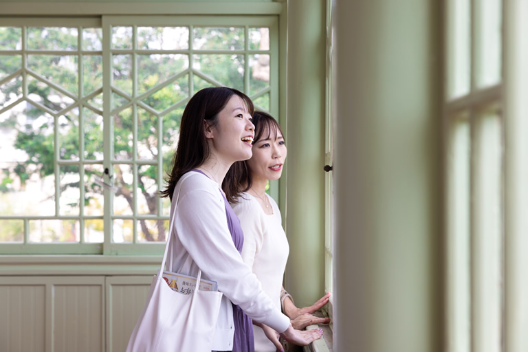 明治36年(1903年)にアメリカ総領事の邸宅として建てられた洋館で、国の重要文化財に指定されています。グリーンの外壁が目を引く外観は、意匠の異なる左右の張り出し窓が特徴的。