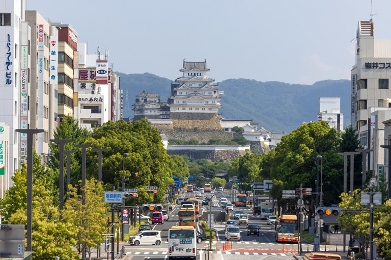 正面の大手前通りの北端にそびえる姫路城大天守が眺められます。