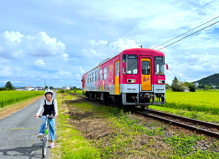 折り畳みのレンタサイクルを車内に持ち込めるので、気になった駅で途中下車して、気ままに沿線散策ができるんです。