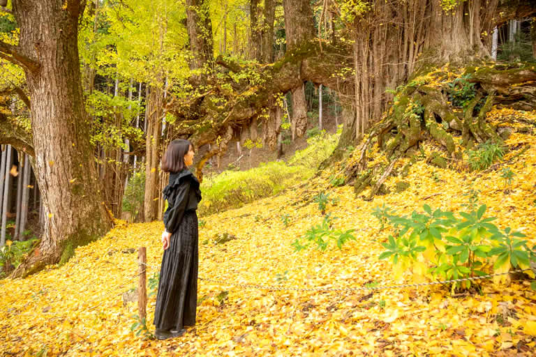 一面黄金色の落ち葉に包まれ、四方八方に大きく枝を伸ばした近畿最大の大イチョウ。何本もの木々で成り立っているように見えますが、一本の樹です。