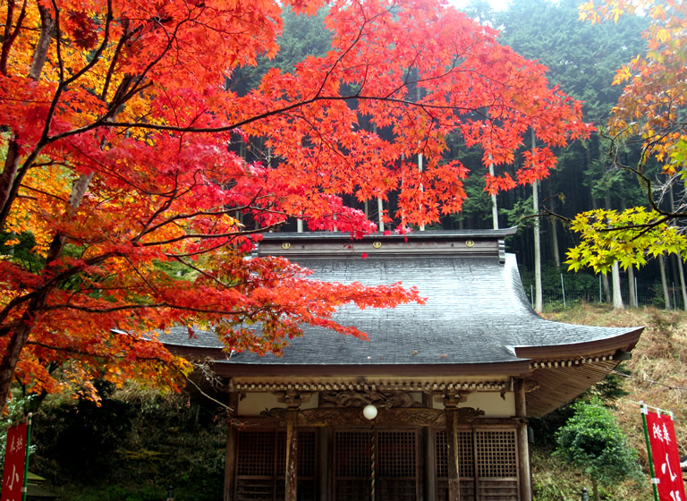 江戸時代に再興された広い境内は、約70本のもみじで鮮やかな秋色に彩られます。