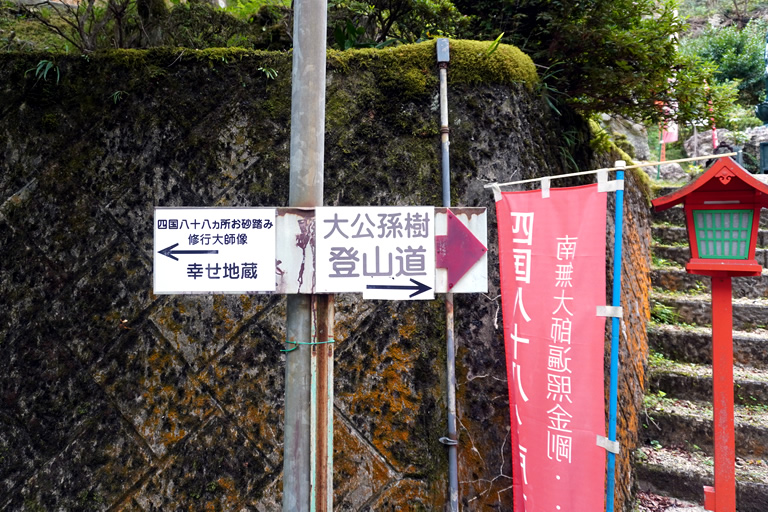 本堂の右手奥に進むと、「登山口」の案内看板が見えます。(※「P2」の駐車場向かいにも大イチョウへ向かう「登山口」があります)