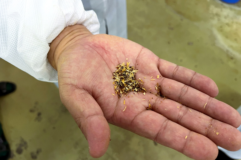 次に、麦汁をろ過して隣のタンクで煮沸し、ホップを投入して苦みや香りを付けます。ウチの「島レモン」はこの工程で淡路島産の天然レモンのピールも加えます』。
