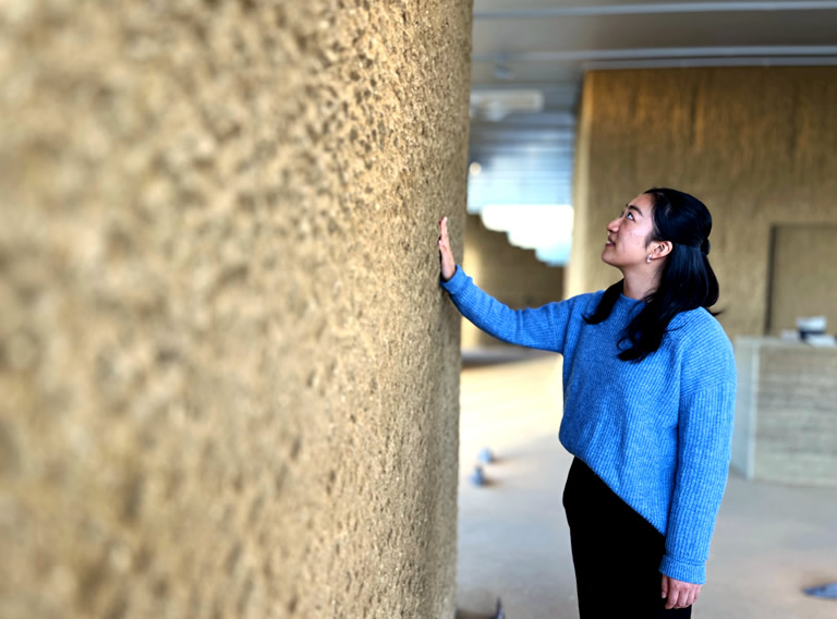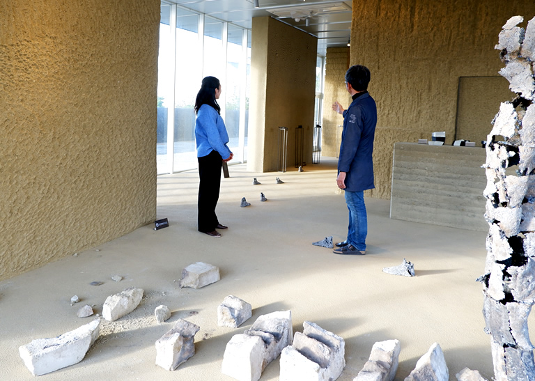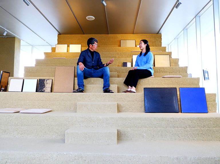 「土階八等」と呼ばれる八段の土の階段は展示台やセミナーなどに活用します。館内トイレの壁や洗面台も土で作られていますが、実際に使って頂けます。人が触れ、年月を経て、土の表情が変わっていく様子を楽しみに再訪してもらえたら嬉しい』。