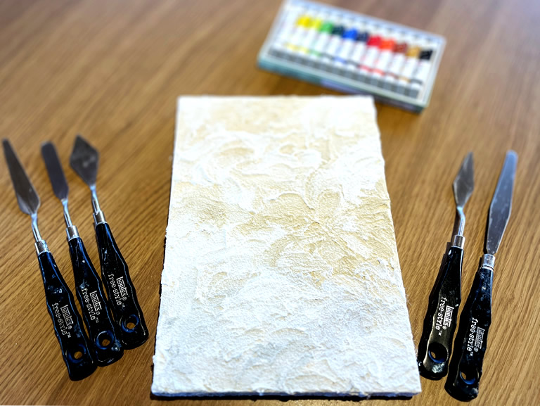 次に、ペインティングナイフを使って、土壁材をパネルに塗りつけていきます。