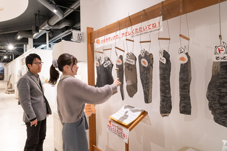 ステゴドンを2階や足の間から眺めたり、鉄琴のようなキレイな音が出る「カンカン石」を演奏させてもらったり。分かりやすく面白い説明付きで、石や鉱物の知識が全くない私でも楽しいんです。滞在時間や興味に合わせてガイドの内容をアレンジしているそうで、満足度が高いです。