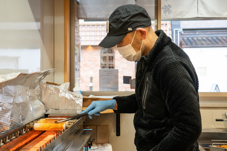 親戚でもある豊岡の老舗蒲鉾店『二方蒲鉾』の竹輪を、専用の回転焼き機を使い、注文を受けてから焼き上げてくれます。焼き時間は約6分。