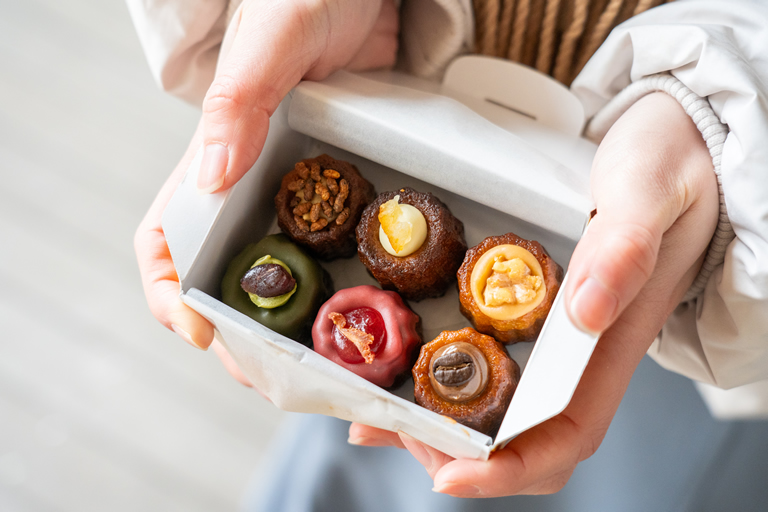 ひと口サイズの小さなカヌレは、上質な素材感ともっちりした食感が最高で、見た目もとっても可愛い♡