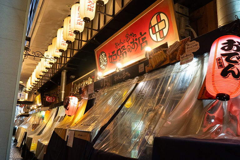 夜はひねぽんや姫路おでんなどご当地グルメが人気の赤提灯の店ではしご酒