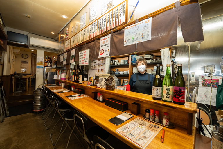 女将さんが温かく迎えてくれる店内は、居酒屋探訪家・太田和彦さんをはじめ有名人の色紙や古いポスターが壁を飾り、ほっこりする雰囲気。