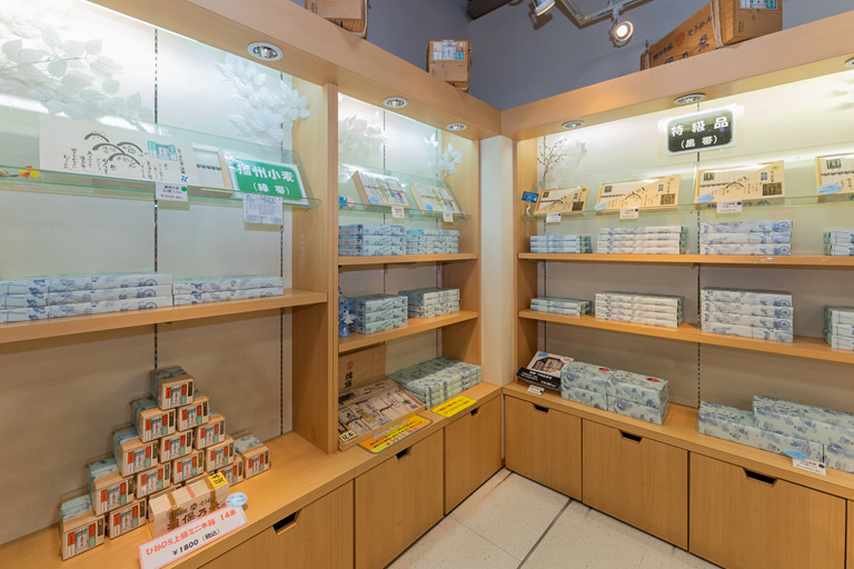 試食コーナーの隣にある売店には、一般にはあまり流通しない特級品や、可愛い木箱入りなど、色んな揖保乃糸が勢揃いしています。