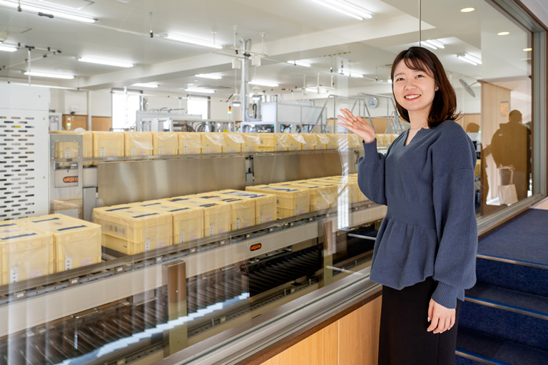 見学ルートにある詰替加工場では、製造者名が記されたそうめんのケースがズラリ並び、梱包作業が行われていました。
