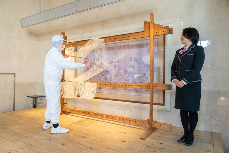館内には揖保乃糸の歴史などを紹介するコーナーのほか、見学できる製造室や売店、レストランなどがあります。