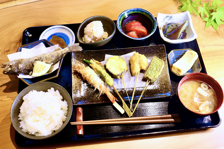 一番人気は、地元食材の創作串揚げや丹波鶏のグリルなどからメインが選べる、「ふむふむ膳」(1,600~2,100円 ※メインによって異なります)。