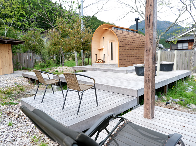 屋外に、雨でもBBQができるインナーデッキや掘りごたつ式の焚火スペースが設けられているほか、貸切で利用できる専用のサウナエリアもあります。