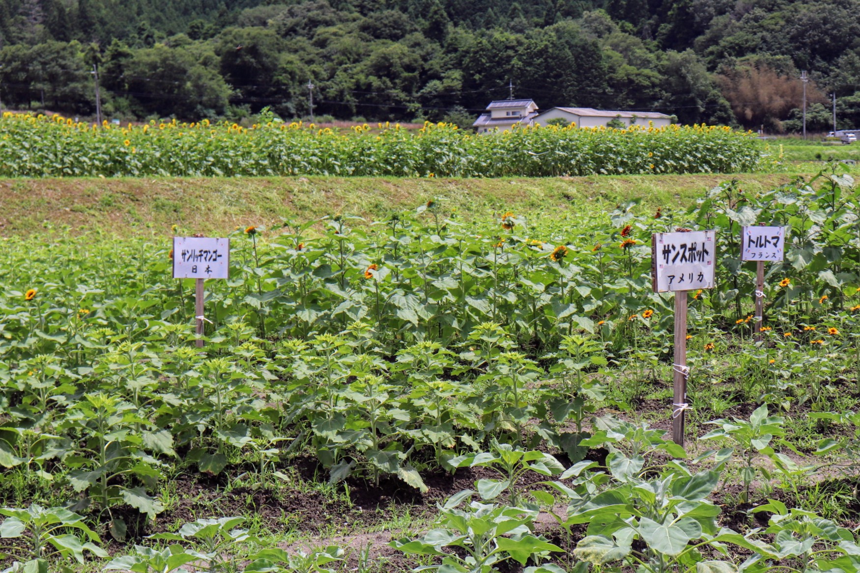 近くの中学校の生徒さんが世話をされている「世界のひまわり園」。一口に「ひまわり」といってもこれだけ多くの品種があるのですね。