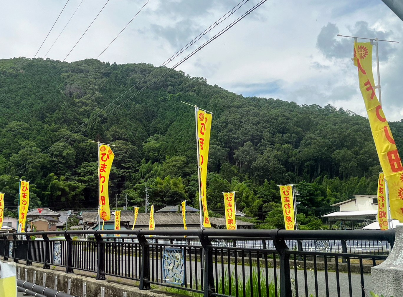 兵庫県の西播磨地区、岡山県に隣接する佐用町の「南光ひまわり祭り」会場へは中国自動道の佐用ICから南光スポーツ公園を目指します。山間部を抜けて千種川沿いをしばらく進むと会場への入口ともなる橋が見えてきました。ノボリに出迎えられて期待が膨らみます。