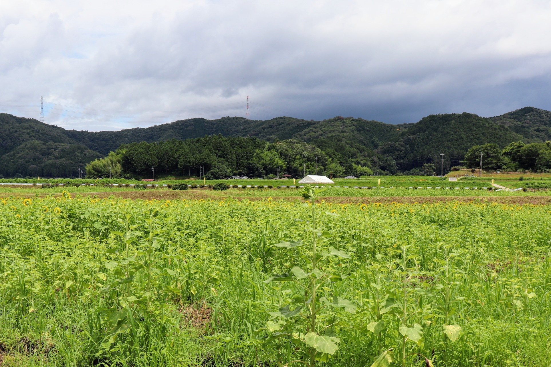 橋を渡って駐車場に車を停め、川沿いの道から「さぁひまわり!」と意気揚々と畑を見渡すも、あれ?花が全部反対側を向いている!?