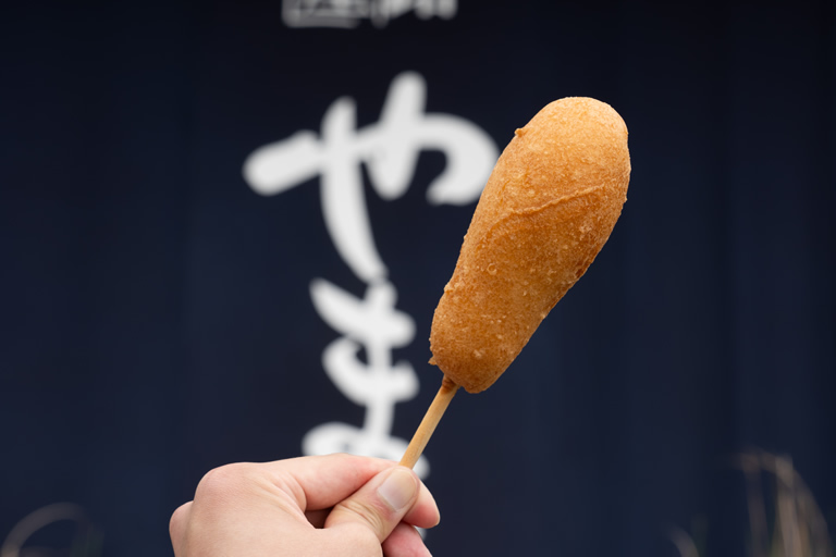 姫路で食べ歩きといえば、ワンハンドグルメ「城下町どっぐ」200円(税込)は外せません。私も大好きで、5年前に初めてアツアツの出来立てを食べたときの衝撃は今でも覚えています。アメリカンドッグのようなほんのり甘い衣と、とろーりとした塩気のあるチーズかまぼこが口の中で合わさってたまらないおいしさなんです。ぜひ試してみてくださいね!