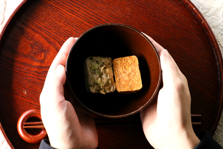もう一方の「じゅわ~っと揚げたなすのおみそ汁」は、その名の通り、噛んだ時にじゅわ~とナスの旨味が広がるように、タイの自社農場で育てた有機栽培のナスを人の手で一つずつ手切り。ゴロっと大き目にカットしたナスを丁寧に揚げ、具材と味噌を別々にフリーズドライしているのだそう。