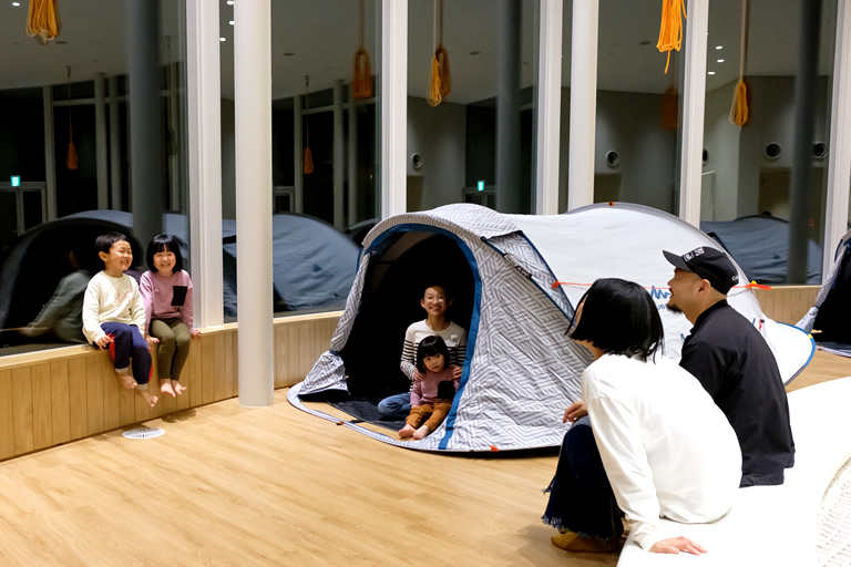 「どんぐりbase」にテントを張って宿泊できるんです。室内にテントって新発想です。