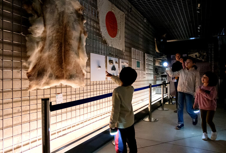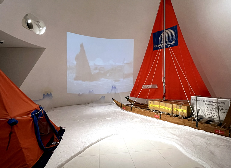 《宇都宮さん談》『釘などを一切使わずに紐だけで組み立てた犬ぞりをはじめ、植村さんが過酷な冒険で実際に使用した装備品なども展示しています。子どもたちが冒険気分を味わえるように、極地の冒険の様子を再現した空間などもあります』。