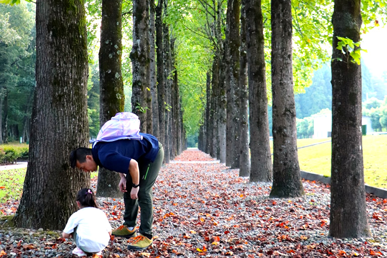 到着するとまずユリノキの並木道があります。11月頃になると黄金色に色づき、フォトスポットとしても人気。