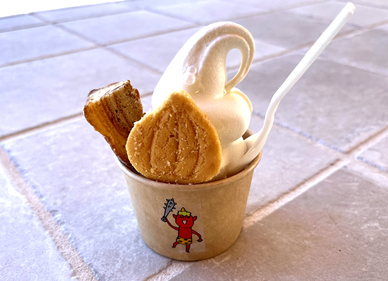 濃厚なソフトクリームの上にハードタイプのバウムクーヘン、下にソフトタイプのバウムクーヘンが入っています。小さなオニオン型のサブレもとっても可愛い。