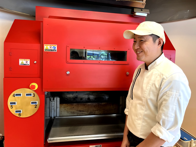 《戸村さん談》『小麦粉と比べ、米粉は水分量が多く膨らみも悪いので、焼き加減が難しいんです。「あわじシルシルバウム」はしっとりした食感を出すために、芯棒から落ちるか落ちないかのギリギリのラインで焼くんですが、その日の気温や湿度によって火の入り方が全く違うので、毎回緊張します。開店当初は何度も心棒からボトッと生地が落ちてしまって大変でした(笑)』。