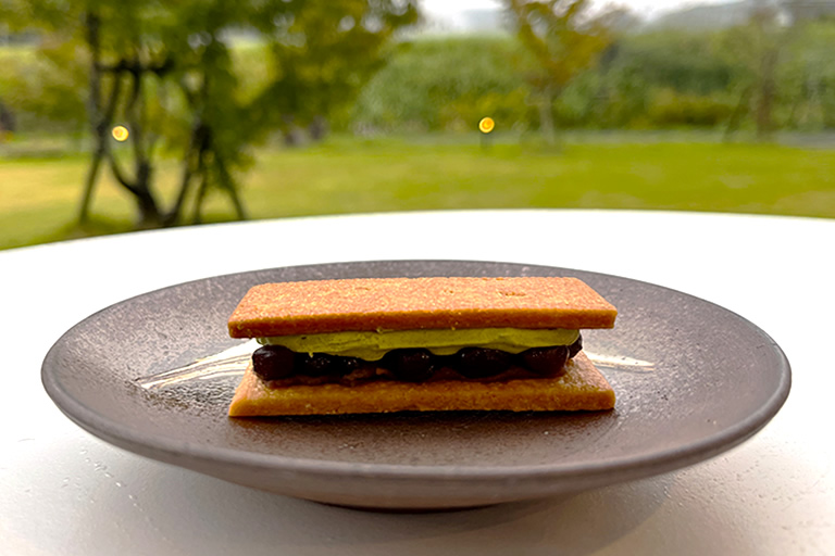 こちらのお店の「あんバターサンド」は、もちろん丹波市で栽培された丹波大納言小豆を100%使用。自社の職人さんが、それぞれの菓子に合わせて炊き上げるというあんこは、小豆本来の味が引き立つ優しい甘さ。あんこと宇治抹茶クリーム、バター、そしてサクサクのクッキー生地の調和が絶妙で、さすが名店のクオリティです!