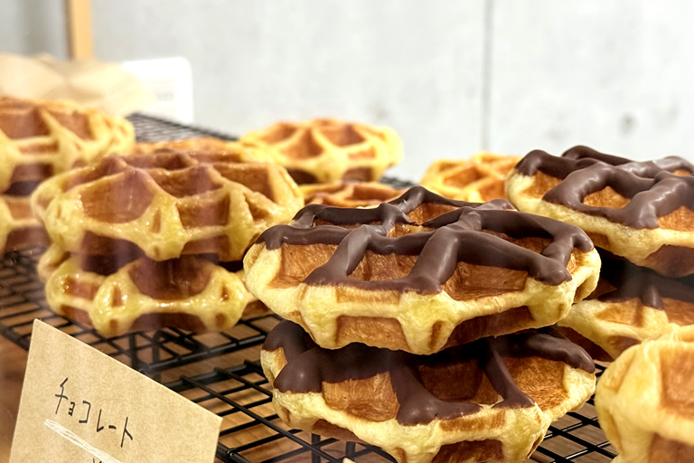 地元産の卵と牛乳を使い、一つ一つ手焼きするワッフルは、ザクザクとしたワッフルシュガーの食感がポイント。