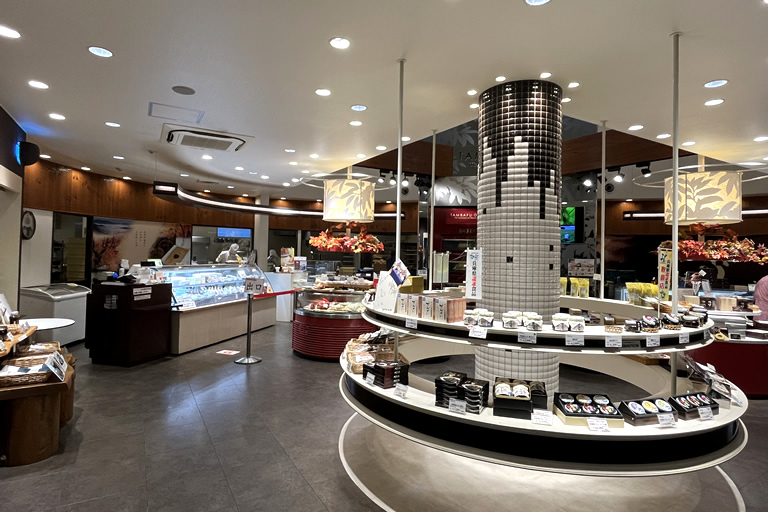 広い店内には、栗、黒豆、小豆はもちろん、牛乳や卵もすべて地元産で作り上げる生菓子や焼き菓子などが多彩に並び、カフェスペースもあります。