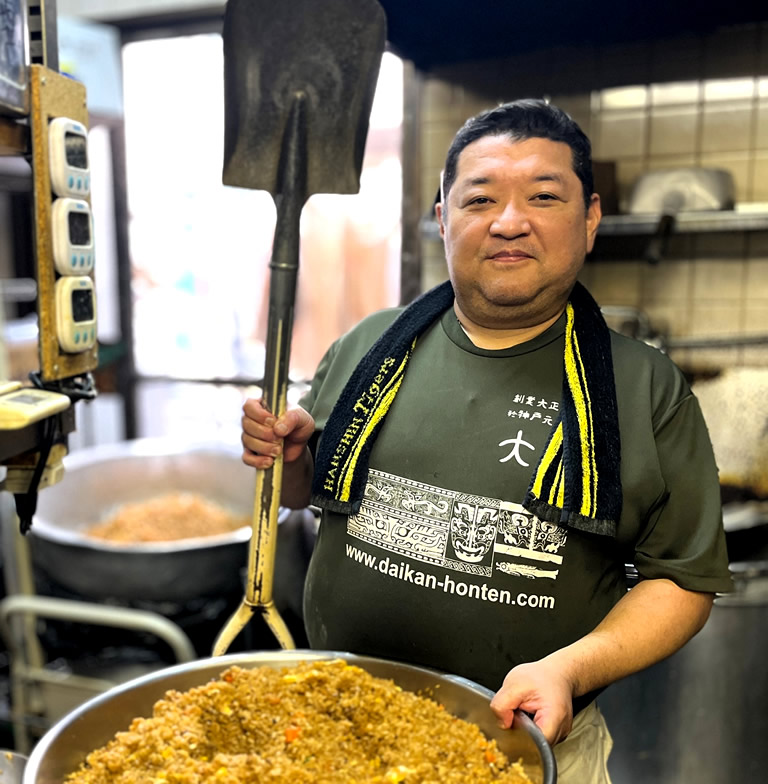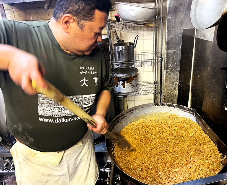 直径130㎝の巨大な中華鍋とスコップを使い、まず一気に約100人前を「地焼き」して、中華そばと同じ醤油素ダレを均一に焼き上げます。そして注文が入ってから、さらに炒めて仕上げます。
