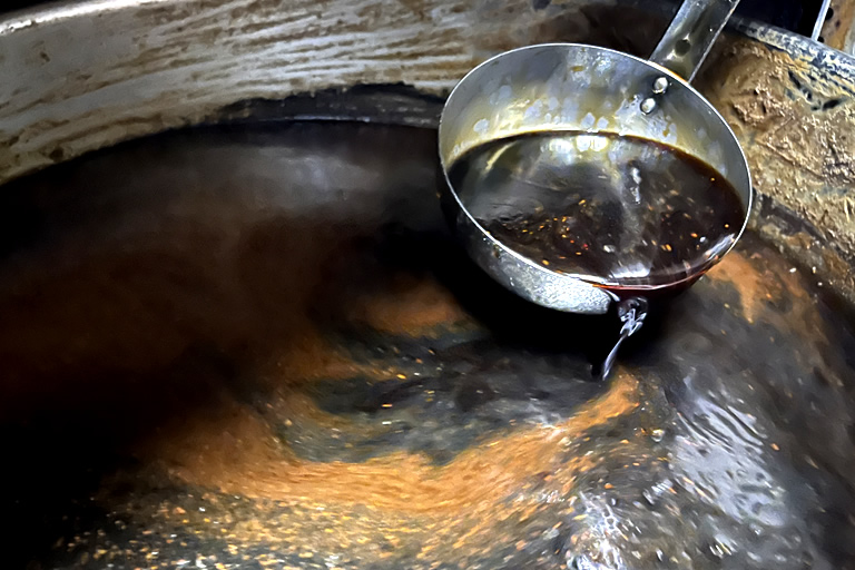 《佐藤さん談》『メリケン粉とニンニクやオリーブオイルなどを弱火で2昼夜かけて炒めます。これを色んな野菜や牛すじなどでコトコト煮込んだスープに加え、10日間かけてデミグラスソースに仕上げます。作り方は創業から50年以上変わりません』。