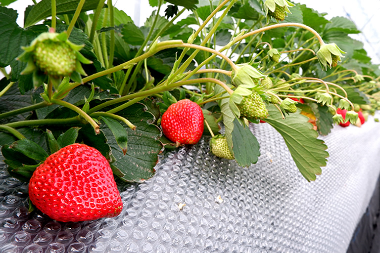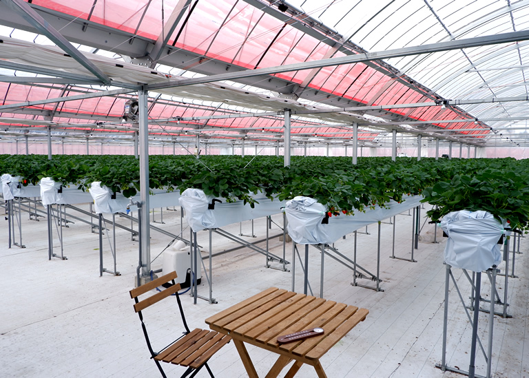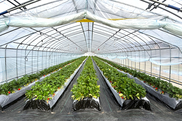 写真映えする巨大なハウスの中では、高設栽培と最新の管理システムを導入し、こだわりのいちごが栽培されています。