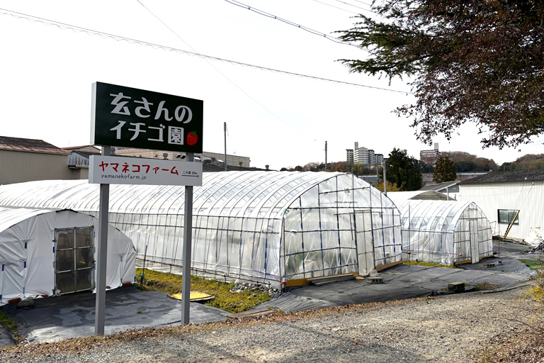 二郎いちごの美味しさの秘密を探るため、二郎地区でいちご部会会長を務めておられる「ヤマネコファーム」の山根康史さんを訪ねました。