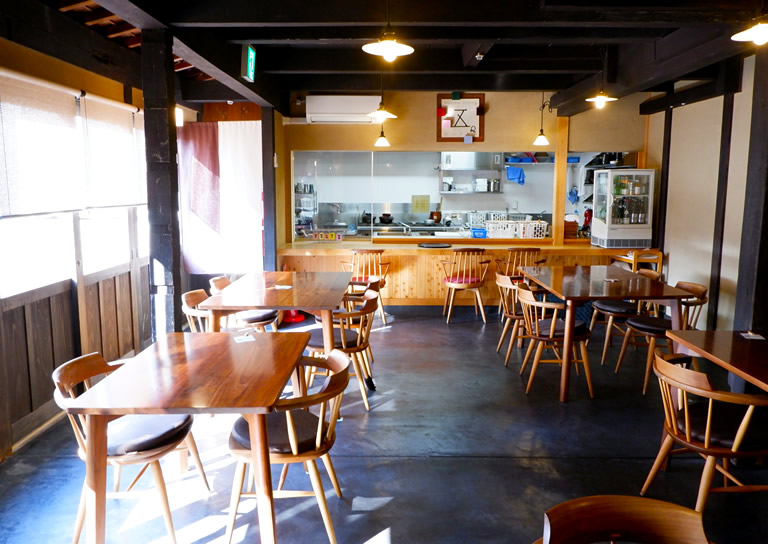 赤穂城の旧城下町の一角、築100年超の古民家を改装した宿「加里屋旅館 Q」は、館内レストランを日中限定カフェとして開放。