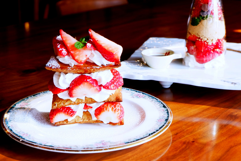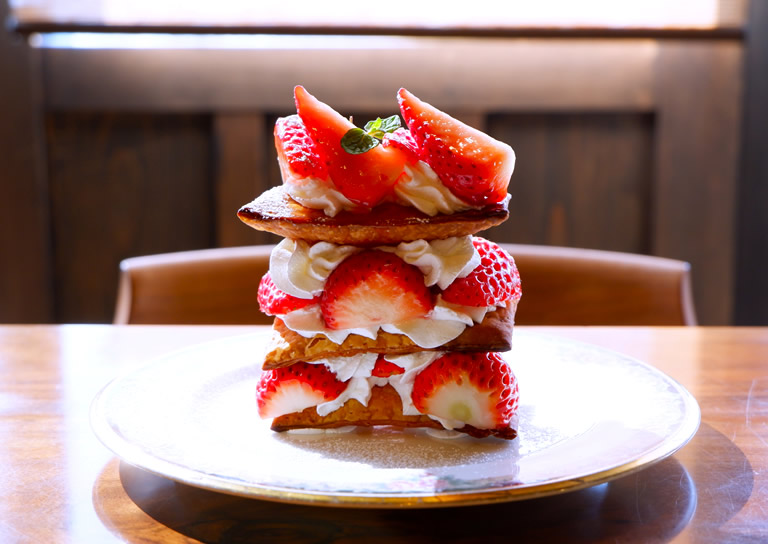 大粒いちごとサクサクのパイを重ねた「いちごとパイのミルフィーユ」770円。