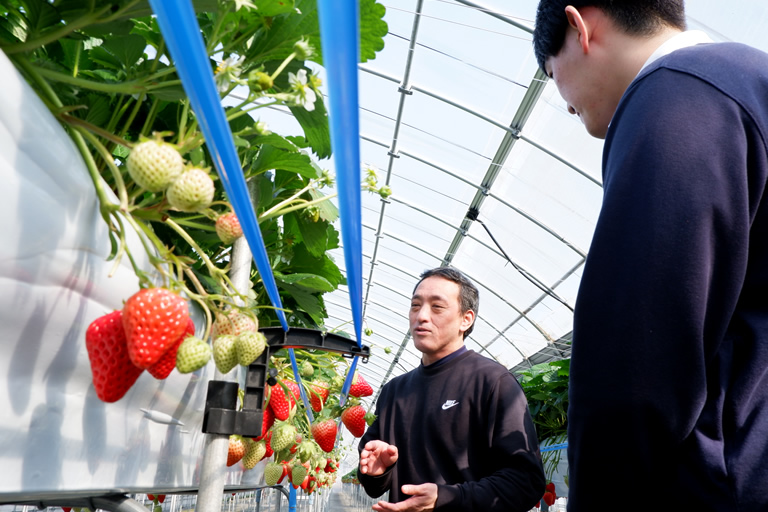 《丸尾さん談》『大きく濃い味になるのは、小まめに花数を減らす摘蕾(てきらい)をして養分を集中させてるからです。いちご狩りは生育状況を見て受け入れ可能な人数を決めるので、先の一週間分しか予約を受け付けないんです。せっかく来てもらうなら美味しいいちごを存分に食べてもらいたいので』。