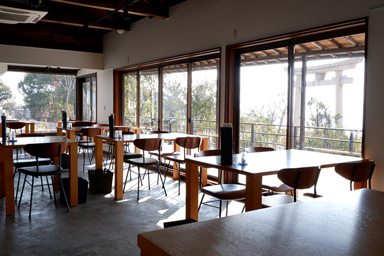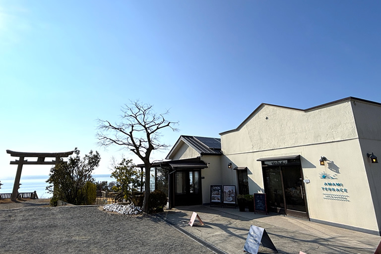伊和都比売(いかつひめ)神社の境内、瀬戸内海を一望する立地にたつ大人気カフェ「AMAMI TERRACE」。