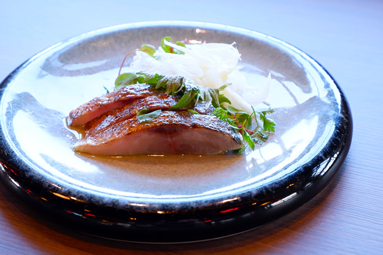 写真は、オードブルの「坊勢サバの炙り」と、魚料理の「金目鯛の鉄板蒸し~蛤の出汁で軽く煮込んだ牛蒡と淡路葱」。今が旬の坊勢サバは脂ノリノリでとろけます。シェフが鉄板で蒸し焼きしてくれる金目鯛は上品な味わい。