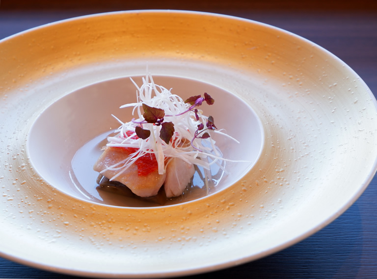 カウンターキッチンでは、地元以外ほとんど流通しない淡路ビーフや由良港の赤ウニをはじめ、淡路島産を中心とした高級食材をシェフが目の前で調理してくれます。