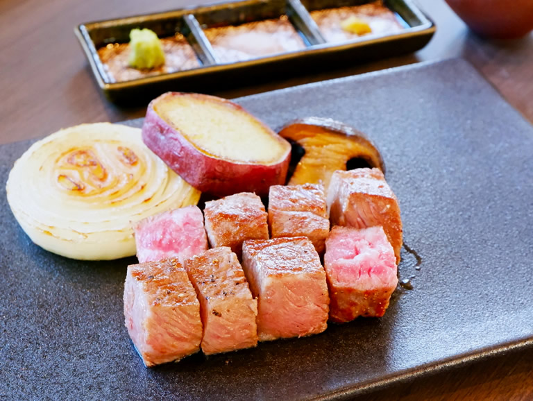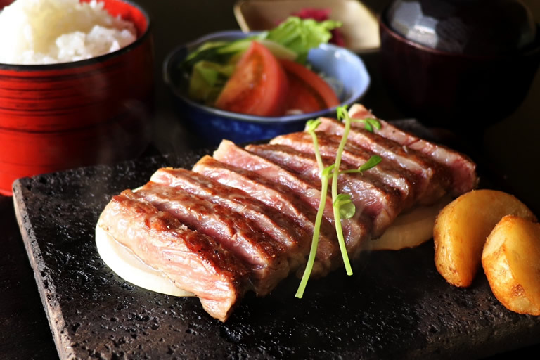 名物は、熱々の溶岩石プレートで焼き上げる「石焼ステーキ」。遠赤外線効果で内部までじんわり熱が入り、旨味を閉じ込めながらふっくら焼き上がります。