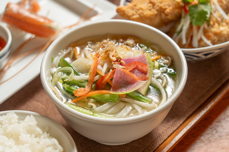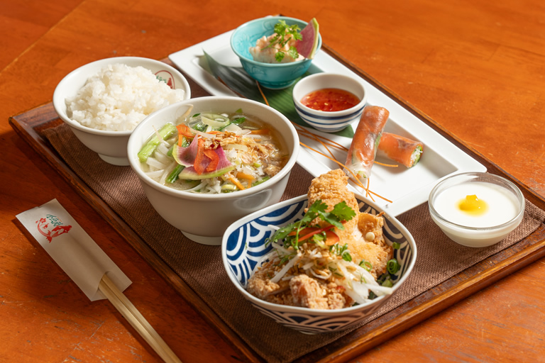 ベトナム米粉麺フォーに日替わりおかず、前菜盛り合わせ2種、ごはん、ミニデザートまで付いて1,188円(税込)。