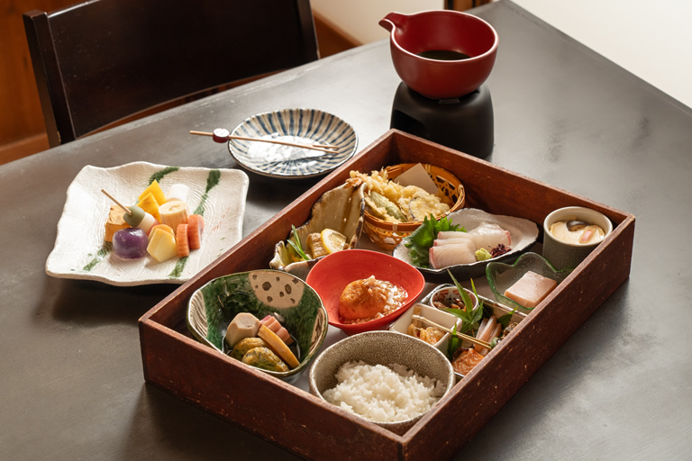 蓋をそっと開けると、お造りや炊き合わせ、天ぷらなど、旬の食材を使って丁寧に調理・盛り付けされた料理が10種類以上。店主・博多勝也さんは、和食一筋45年の料理人。お料理には、「自分が本当においしいと思うものしか出さない」という、心意気が料理に表れています。